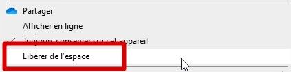 Pour libérer votre fichier c’est facile, il faut faire clic-droit puis « libérer espace » sur le fichier ou le dossier que vous voulez.