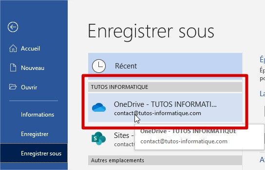 Prenons l’exemple d’un fichier Word, je peux rédiger mon document puis choisir de l’enregistrer dans mon espace OneDrive directement depuis le logiciel.